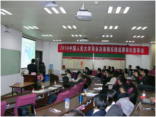 本次大赛由来自全校17学院的372名参赛选手组成了124个团队参加。所有参赛团队分布在11个赛区通过网络平台进行初赛,各赛区前两名晋级决赛;决赛分为网络决策模拟和模拟董事会两个部分。决赛网络决策模拟各赛区前4名(2个赛区,8个团队)及2个自愿申请的决赛团队共计10个团队进入了模拟董事会环节,于11月10日下午在明德商学楼304教室进行了展示。