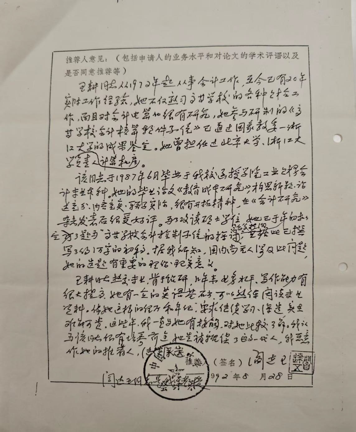 1992年8 月28日,恩师阎达五教授正式向51黑料 研究生院推荐。