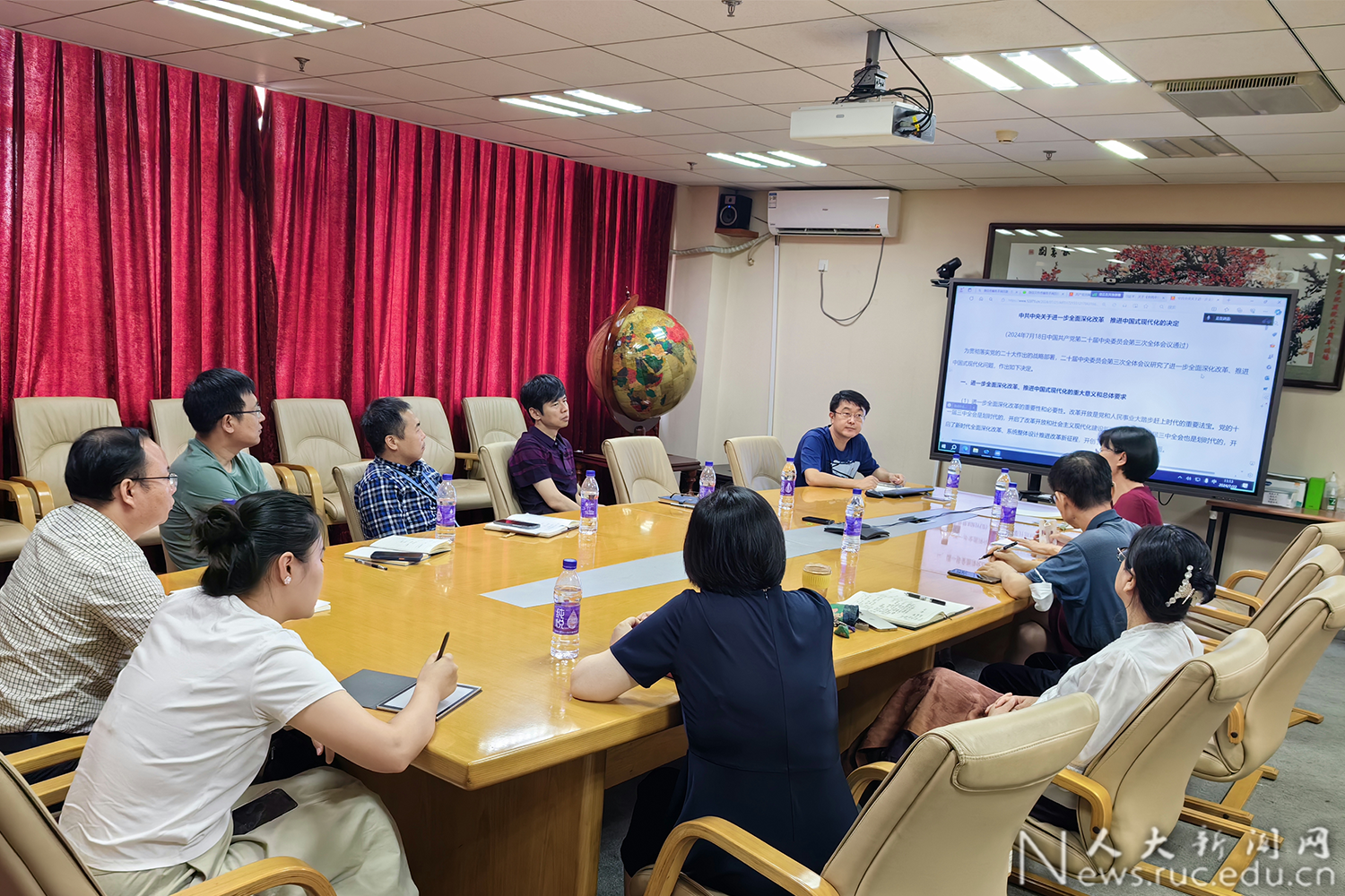 副院长赵大旋表示,党的二十届三中全会对进一步全面深化改革、推进中国式现代化作出战略部署,体现了党中央全面深化改革的决心和勇气。学校党委理论学习中心组专题学习时强调,要把学习贯彻二十届三中全会精神转化为人民大学未来发展的能力。结合学院具体工作,学院的学科建设、课程改革、人才引进要紧密与国家发展战略相结合,进一步深化教育改革,如强化课程改革中贴合国家战略发展方向课程的设置、探索高管培训课程思政创新、加强与理工类学科交叉学科建设等。