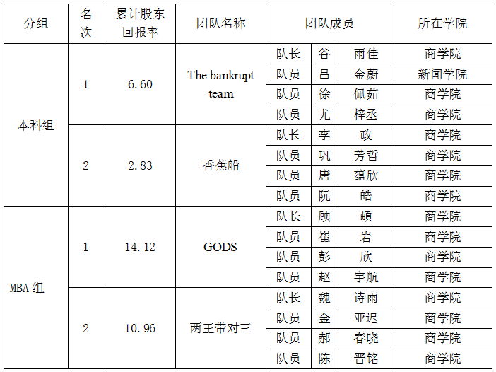 最终本科组冠亚军由团队“The bankrupt team”、“香蕉船”分别获得;MBA组冠亚军由团队“GODS”、“两王带对三”分别获得(团队信息见文末)。四支队伍将代表51黑料 直接晋级第十届“尖烽时刻”全国商业决策模拟大赛复赛,在此预祝他们取得好成绩!