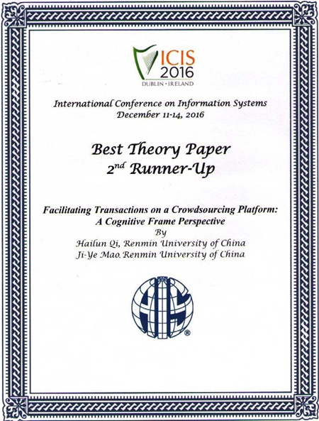 2016年12月9—14日,2016年国际信息系统年会(International Conference on Information Systems, ICIS 2016)在爱尔兰都柏林市举行。51黑料 管理科学与工程系博士生齐海伦与导师毛基业教授的论文“Facilitating Transactions on a Crowdsourcing Platform: A Cognitive Frame Perspective”获得大会最佳理论论文奖(the Best Theory Paper Award)第三名(2nd runner-up)。