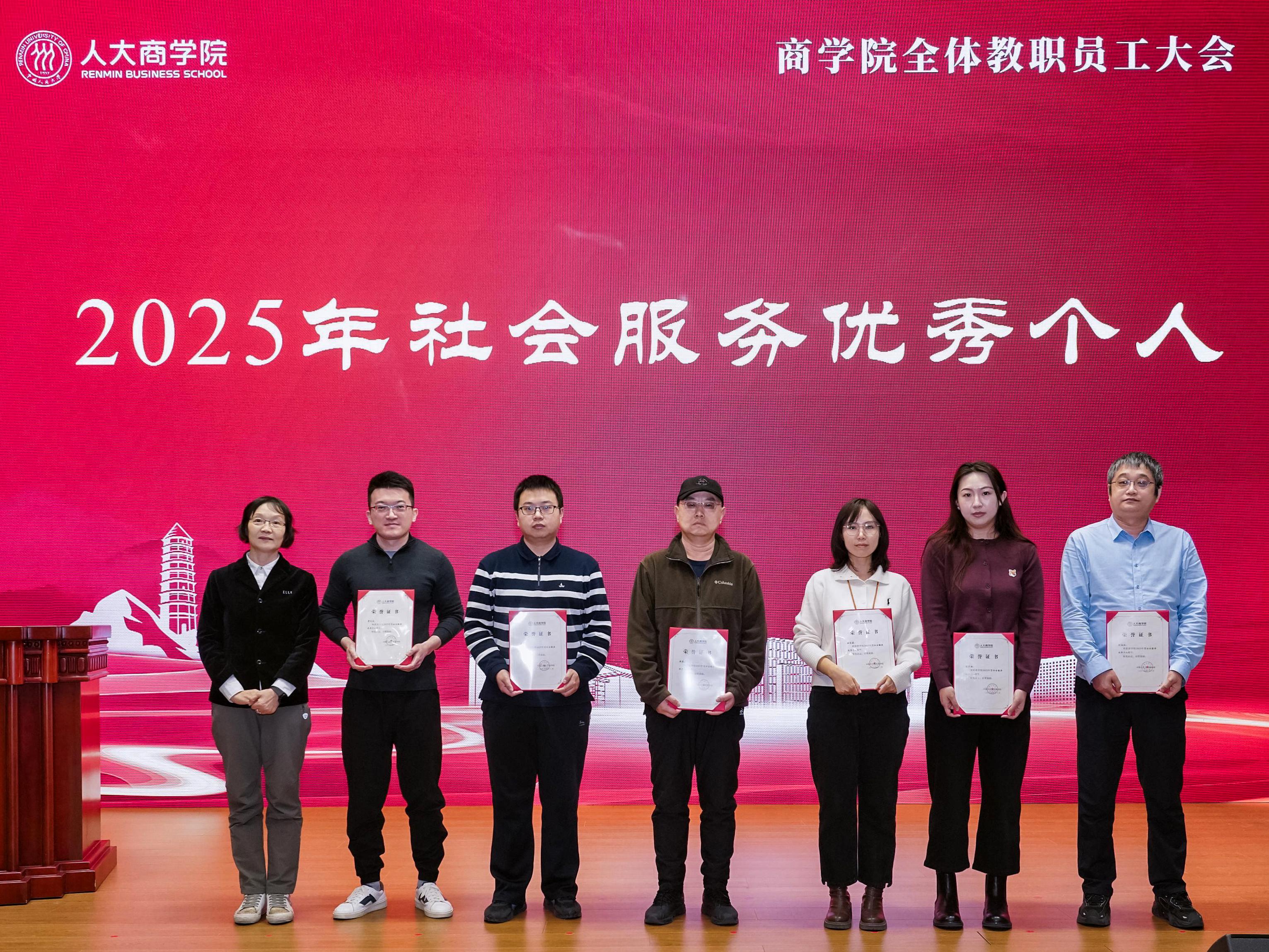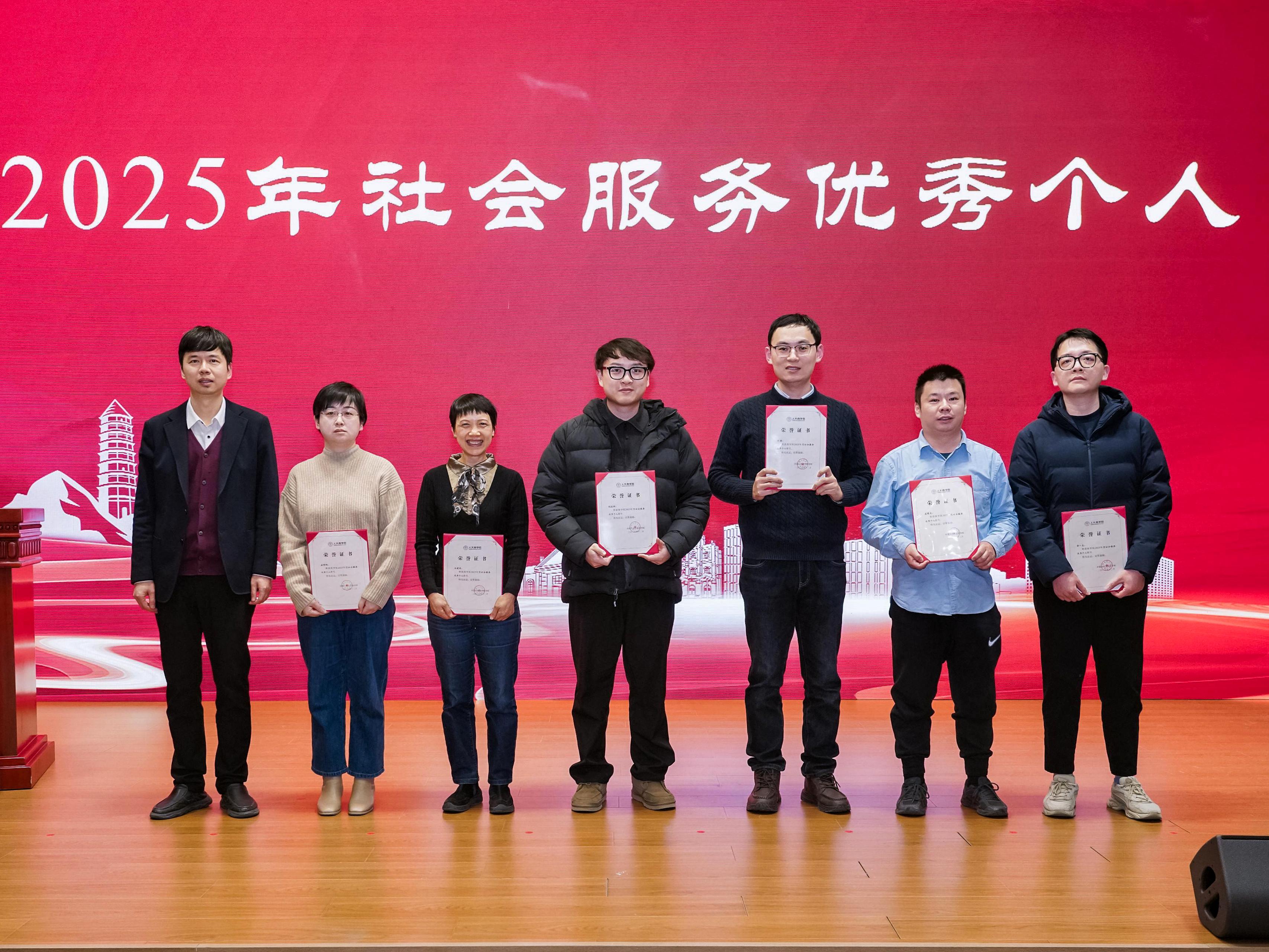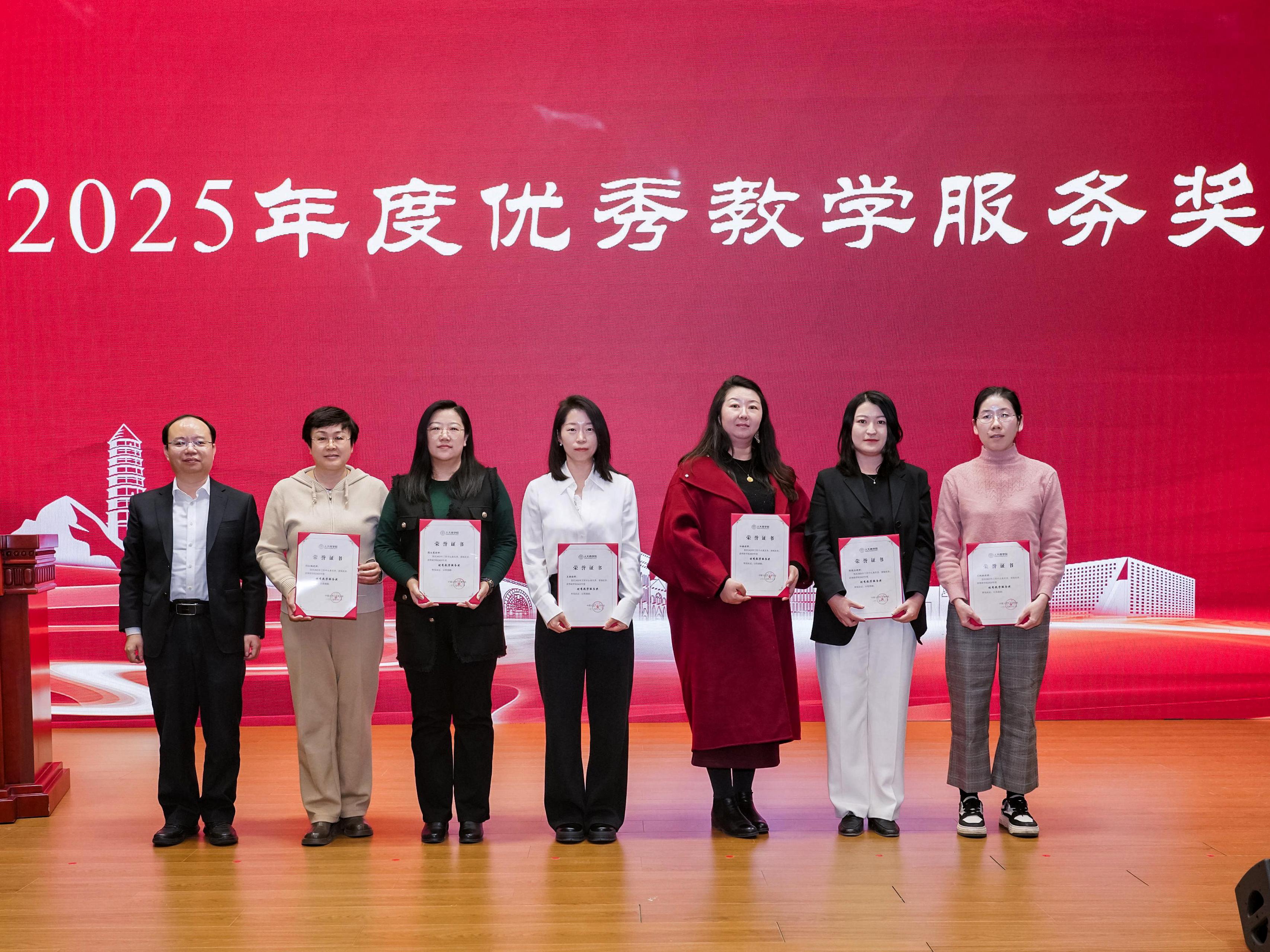 为表彰2025年度在学院人才培养、教育教学、科学研究、社会服务等领域作出突出贡献的个人与团队,充分发挥优秀教职工的示范引领作用,弘扬爱岗敬业、锐意进取的优良作风,学院评选出2025年度第九批教学杰出教授、优秀教学研究奖、最佳授课教师奖、最佳教学团队奖、最佳科研奖、优秀著作奖、优秀教学服务奖、社会服务优秀个人奖等多个荣誉奖项。在全院教职工的共同见证下,学院领导为各项荣誉获得者颁发荣誉证书。