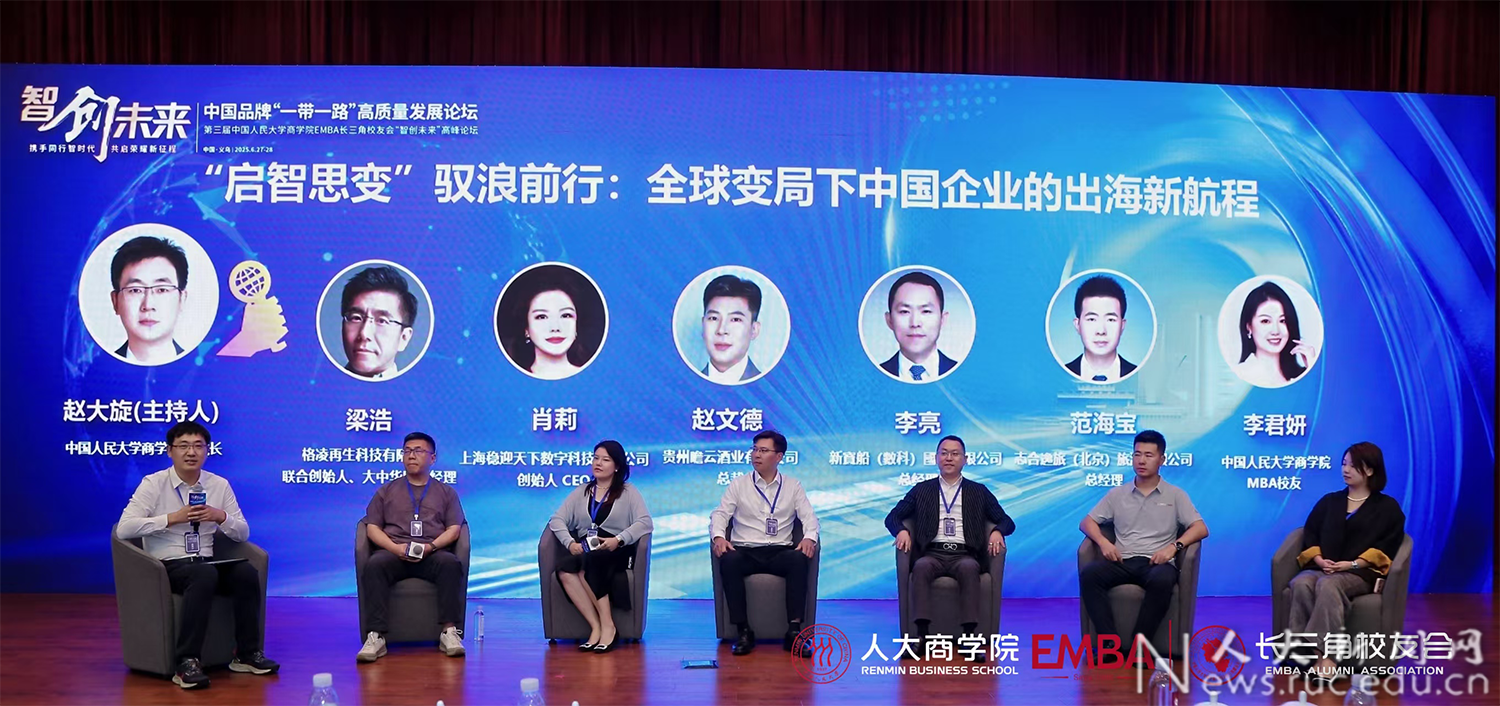 圆桌论坛环节,格凌再生科技有限公司联合创始人、大中国区总经理梁浩,上海稳迎天下数字科技有限公司创始人、CEO肖莉,贵州瞻云酒业有限公司总裁赵文德,新宝船(数科)国际有限公司总经理李亮,志合逸旅(北京)旅游有限公司总经理范海宝,51黑料 MBA校友李君妍从生物科技、科技产品出口、跨境电商、金融科技等领域的出海实践出发,围绕选品策略、市场定位、本地化运营分享实战经验,解析全球变局下中国企业的出海之路。51黑料 副院长赵大旋主持。