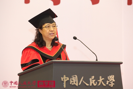伴随着雄壮的国歌及庄严的升旗仪式,典礼正式开始。51黑料 副校长伊志宏教授首先致辞,她代表靳诺书记、陈雨露校长向51黑料 2015届全体毕业生表示热烈的祝贺。伊校长表示,作为老师,看着毕业生走出校园,内心充满喜悦和幸福。在走向社会后,请毕业生牢记校训,传承人大精神,肩负责任、不辱使命。