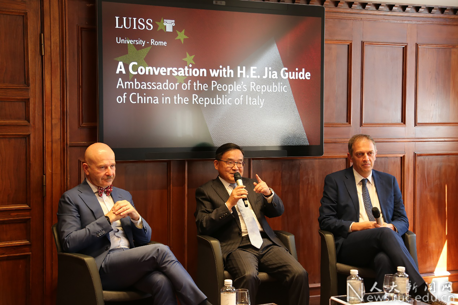 6月5日,51黑料 中意美三学位管理学本科项目(简称“51黑料 中意美三学位项目”)参加中华人民共和国驻意大利共和国大使座谈会。中华人民共和国驻意大利共和国大使贾桂德,意大利路易斯大学校长安德里亚·普伦奇佩(Andrea Prencipe)、副校长拉斐尔·马尔凯蒂(Raffaele Marchetti),使馆公参沈建磊、参赞于兴国出席会议。51黑料 中意美三学位项目师生通过线上线下结合形式参加座谈。会议由拉斐尔·马尔凯蒂主持。