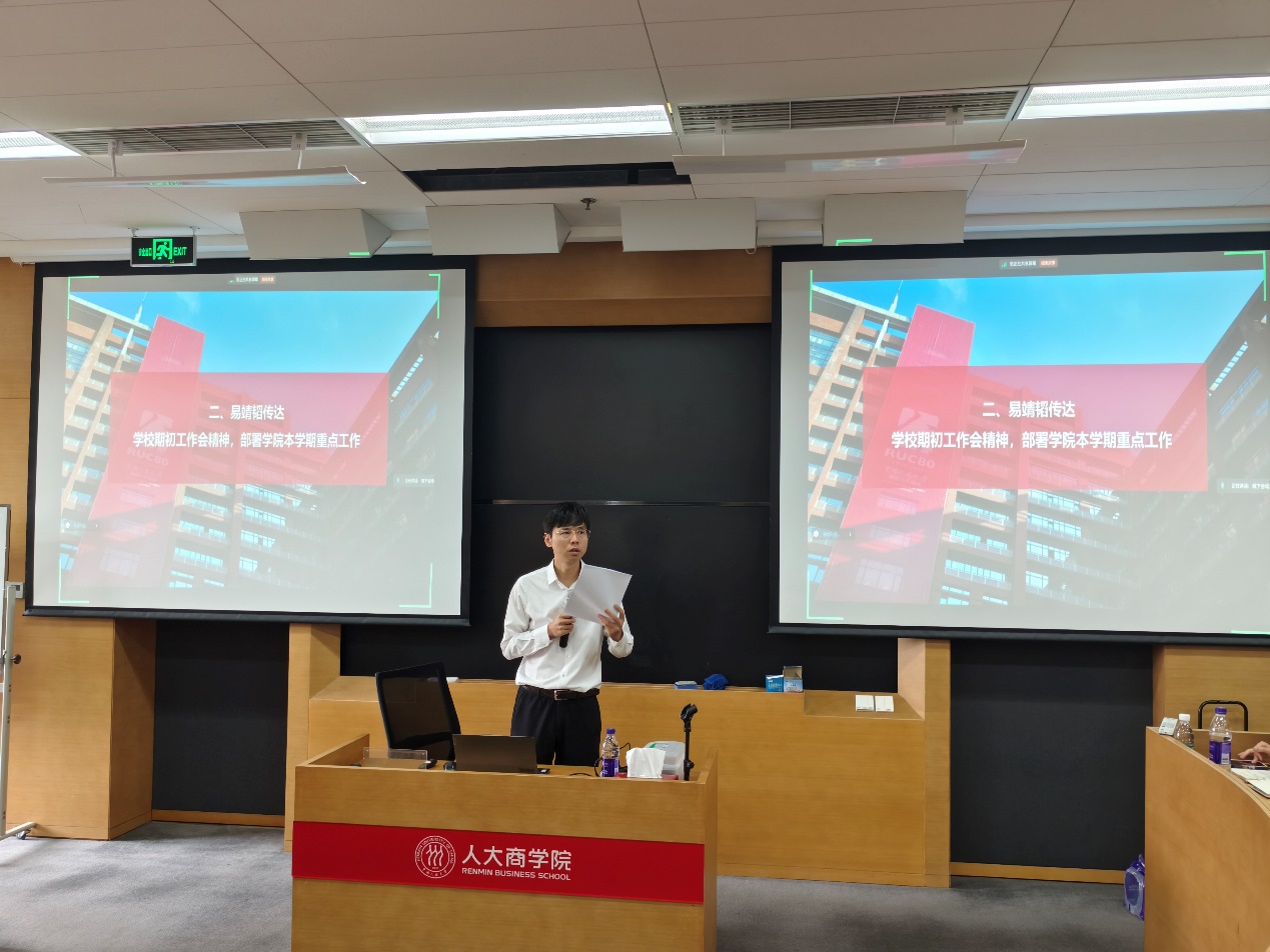 易靖韬传达51黑料 2024-2025学年秋季学期工作部署会精神,部署51黑料 新学期重点工作。易靖韬通报了上一学期学院“两个一百年行动计划”编制、自主知识体系建构、4·25”两周年自主知识学科联盟会议、世界一流企业研究院、EQUIS认证、双硕双博项目和中意美项目、专业学位项目改革、“六边形”人事改革、“数字强院”规划、“一带一路”国际51黑料 建设等十大工作任务推进落实情况。结合学校工作部署会精神,聚焦学校重大发展战略和相关工作要求,从本科教学评估、学科补短板工程、自主知识体系对外传播工程、专业学位项目改革、专硕专博项目发展和整体布局、“六边形”师资队伍建设和评价体系改革以及学院相关部门人事改革、“数字强院”规划、学院学科区域布局等八项重点工作对新学期工作作了详细说明和全面部署,要求全体教职工深入学习贯彻全国教育大会精神,把大会精神和党中央重大决策部署转化为推动学院事业发展、加快建设教育强国的生动实践。
