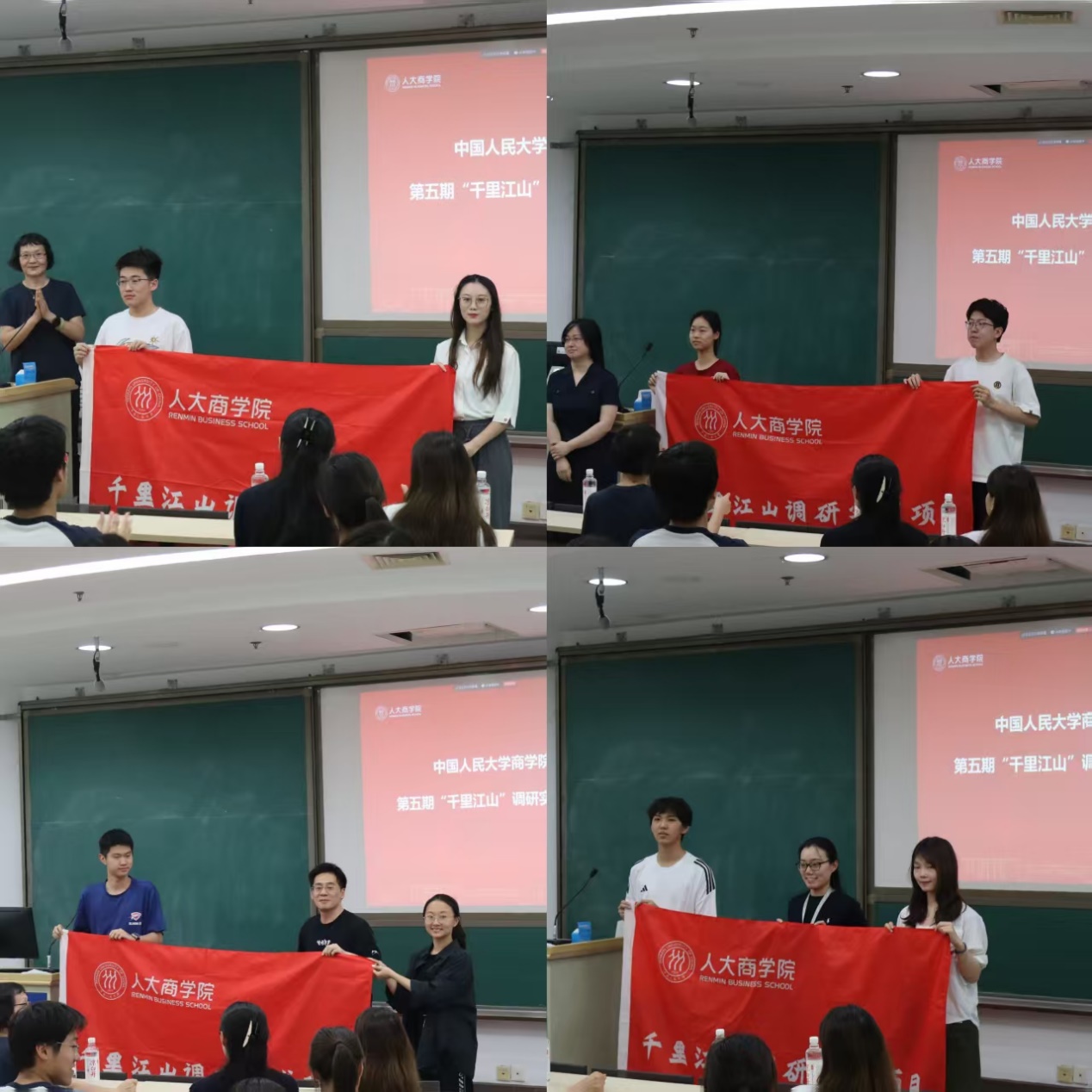 在授旗仪式环节,方玉萍、石明明、吴江华和王慧将“千里江山”旗帜授予新疆、安徽、上海、广东四个团队的学生代表,并勉励同学们带着学院和校友们的嘱托,在实践中成长成才。