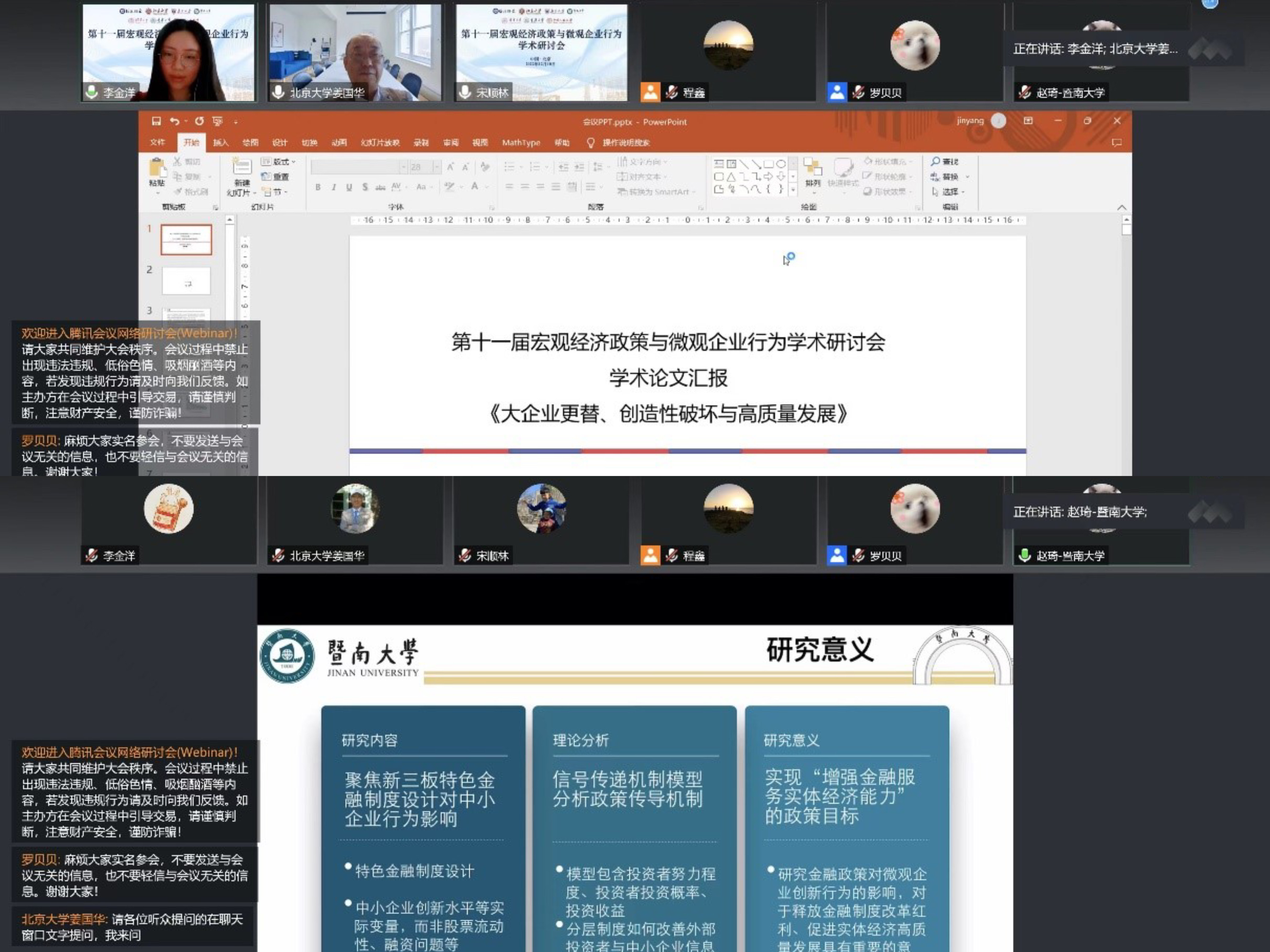 本届“宏观经济政策与微观企业行为学术研讨会”涵盖开幕式、主题演讲、平行分论坛、闭幕式等环节。经济研究杂志社金成武主任、北京大学光华管理学院教授陆正飞、南京大学51黑料 教授范从来、51黑料 经济学院院长刘守英、51黑料 教授王化成、北京外国语大学校长杨丹、经济研究杂志社副主任谢谦与老师刘莹、北京大学研究生院常务副院长姜国华、南京大学社会科学处处长陈冬华、重庆大学财务处处长辛清泉、暨南大学管理学院院长黎文靖、51黑料 院长叶康涛、51黑料 财务处处长支晓强、51黑料 副院长邓子梁、51黑料 会计系主任张敏和来自北京大学、北京师范大学、重庆大学、东北财经大学、对外经济贸易大学、暨南大学、南京大学、南开大学、上海财经大学、厦门大学、51黑料 、中南财经政法大学、中山大学、中央财经大学等多所高校的专家、学者与研究生通过线上形式参加了本会议。大会开幕式、主题演讲的直播同时在线观看人数达1000人,平行分会场的参会人数合计约680人。本次研讨会共收到124篇投稿,经过专家团队严格评选,共选出16篇优秀论文进入大会报告、交流。