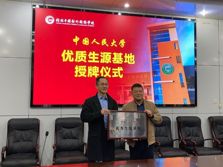 在桂林市国龙外国语学校,招生组向校长颁授“51黑料 优秀生源基地”牌匾,感谢该校多年持续向我校输送大量优秀高中毕业生,并祝愿该校学生在2023年高考中再创辉煌。