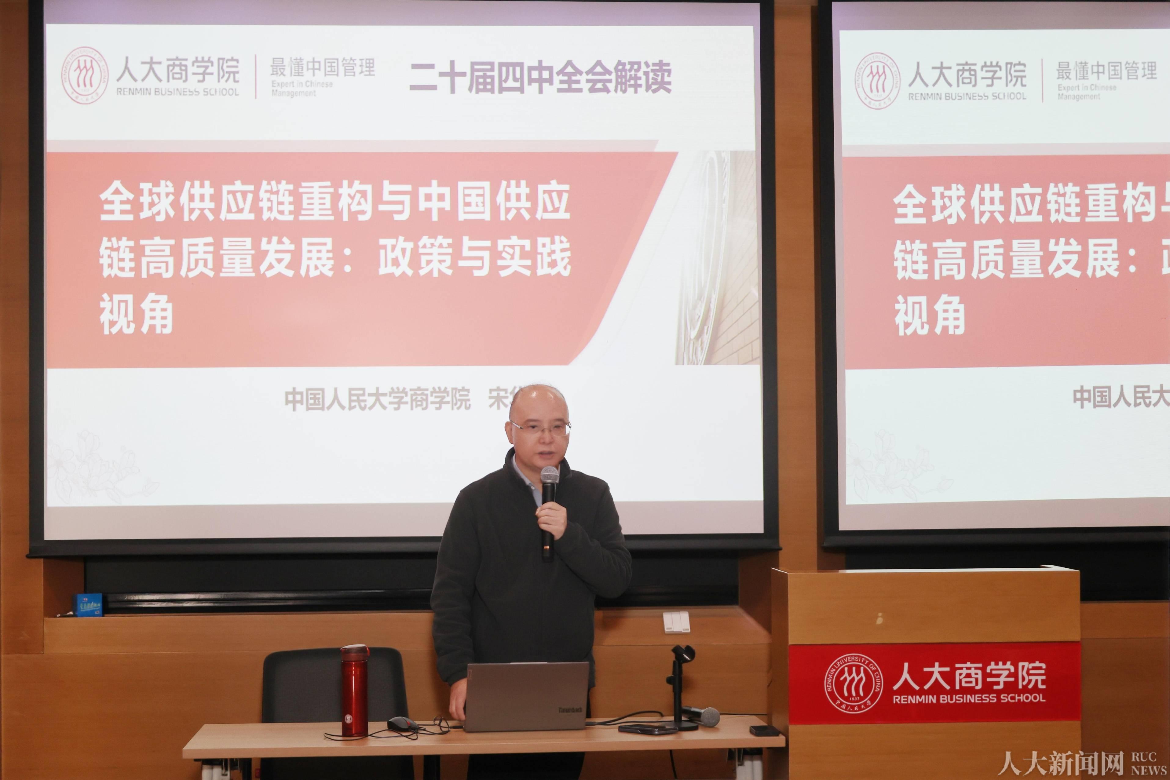 宋华作“党的二十届四中全会解读——全球供应链重构与中国供应链高质量发展:政策与实践视角”的主题讲座。他从党的二十届四中全会提出的“提升产业链自主可控水平,强化产业基础再造和重大技术装备攻关,滚动实施制造业重点产业链高质量发展行动,发展先进制造业集群”的战略部署出发,系统梳理了全球产业链的重构过程,全面分析了中国产业链供应链的政策走向和发展成果,并结合近年调研中国企业的创新实践、参与国家政策制定的宝贵经历分享了“数字经济推动产业链供应链现代化水平提升的机制研究”社科重大课题的理论思考。他强调,中国式现代化的火热实践为开展学科研究提供了宝贵的富矿。要持续深入企业一线,聚焦真问题,研究真情境,从中凝练中国管理理论,不断推动理论和实践创新;要充分发挥专业优势,积极参与政府决策、服务经济社会发展,彰显学者的社会责任。