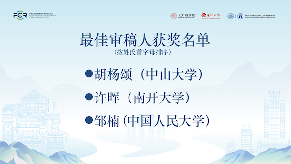 本届论坛共收到221篇参会稿件,最终收入论文集118篇,其中分论坛报告40篇,圆桌讨论78篇。在此基础上,经程序委员会和匿名外审两轮评审以及两轮排序评审,共评选出最佳论文10篇。除此之外,还评选出3位最佳审稿人。11月13日上午,毛基业向大会通报了本届论坛论文的评审流程、最佳论文和最佳审稿人的评选结果。