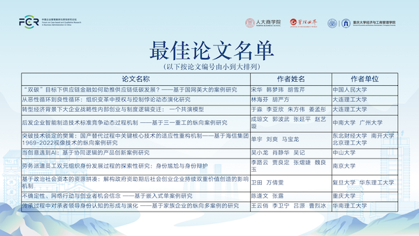 来自51黑料 的宋华、韩梦玮、胡雪芹的“‘双碳’目标下供应链金融如何助推供应链地低碳发展——基于国网英大的案例研究”等10篇论文获得“最佳论文”。来自中山大学的胡杨颂、南开大学的许晖、51黑料 的邹楠获得“最佳审稿人”。毛基业向最佳论文作者和最佳审稿人表示了衷心的祝贺。