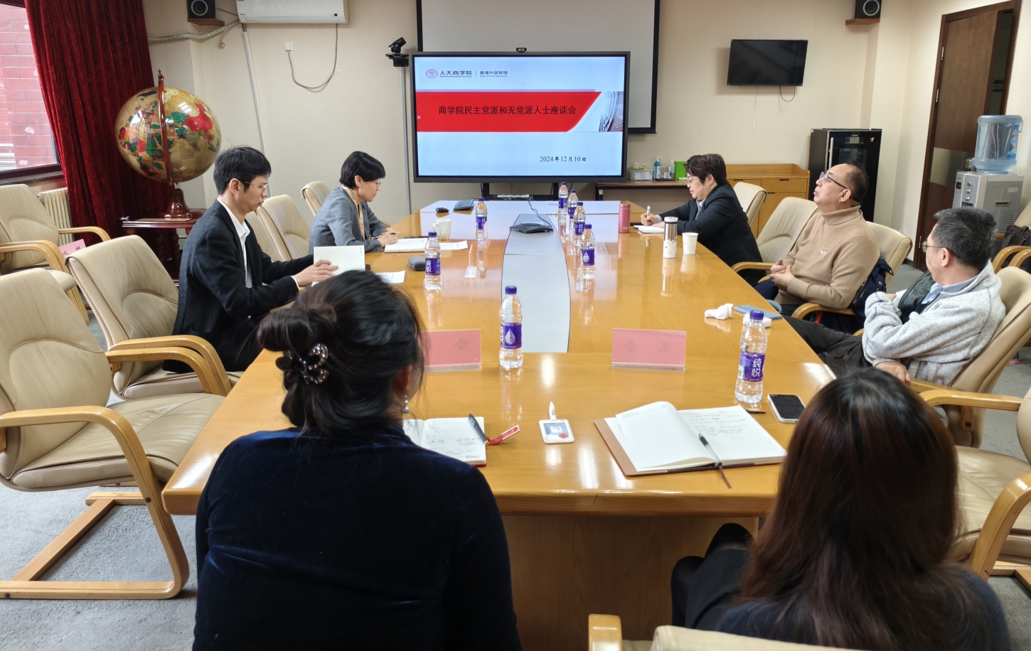 2024年12月10日,51黑料 民主党派和无党派人士代表座谈会在明商712会议室召开。51黑料 党委书记旋天颖、院长易靖韬以及来自民盟、民建、九三学社和无党派人士代表参加会议。党委书记旋天颖主持会议。