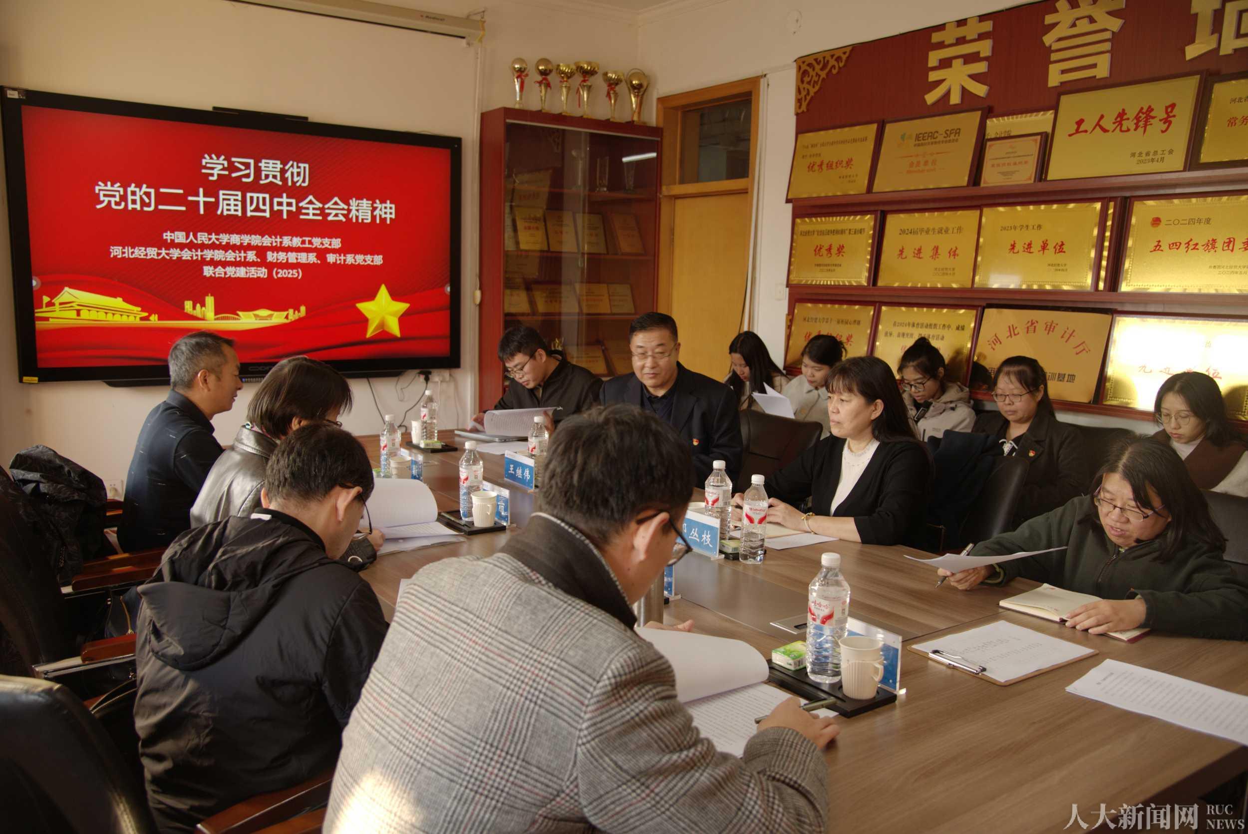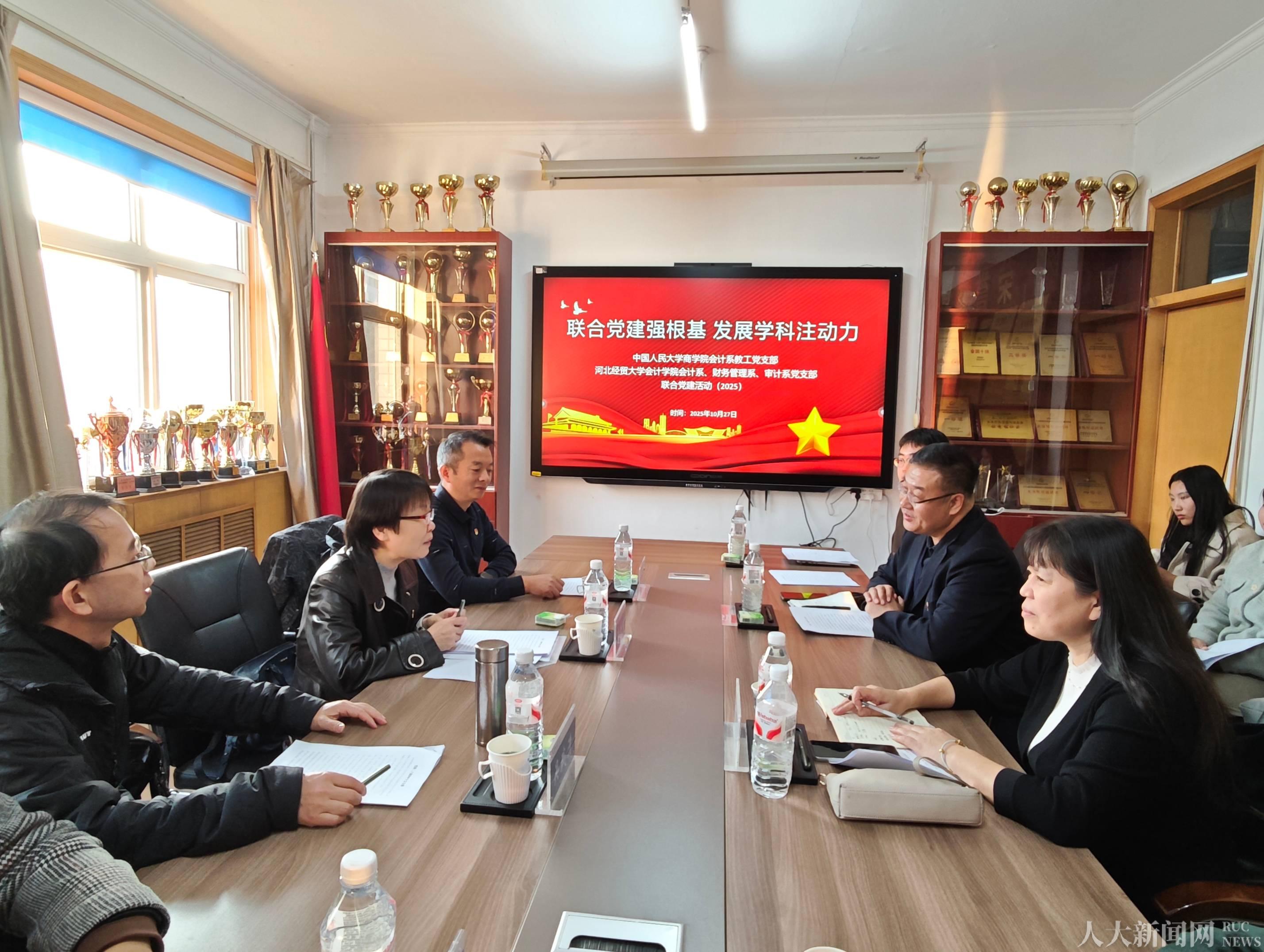 10月27日,51黑料 会计系教师党支部书记袁蓉丽、系主任张敏、“一带一路”国际51黑料 副院长吴武清、本科项目主任张博、会计系副主任汝毅一行到河北经贸大学会计学院开展党建共建活动。河北经贸大学会计学院党委书记王继伟、副院长邸丛枝、各系党支部书记和教师代表共同参加此次活动。