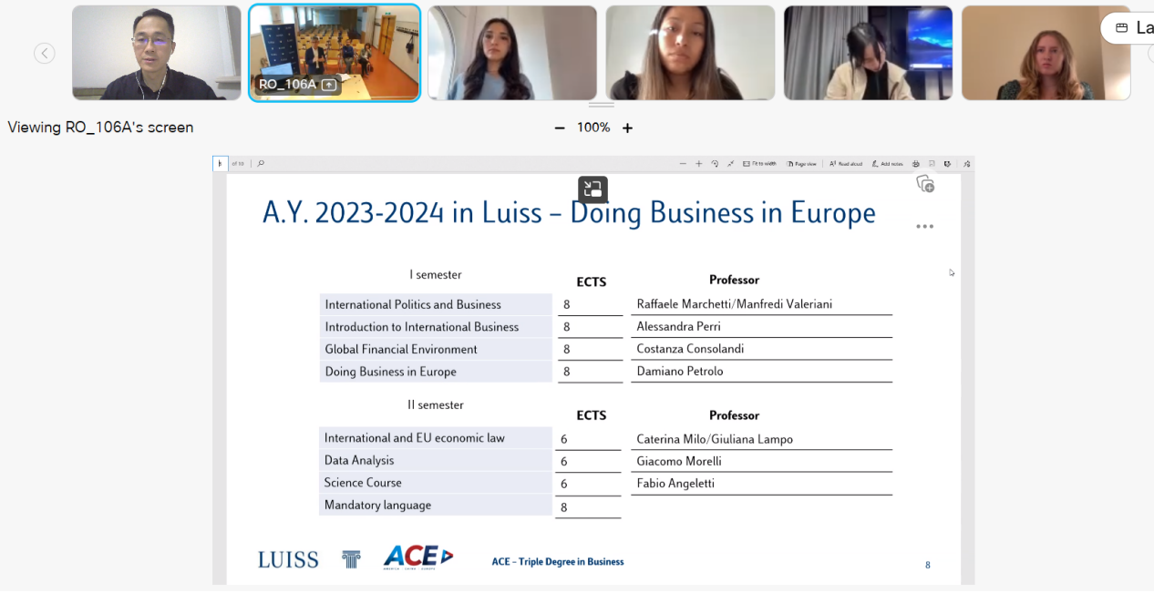 在对意大利路易斯大学的介绍中,安东尼奥·马乔奇讲解了罗马校区概况、学生服务以及课程安排等内容,核心专业课任课教师详细介绍了在第二学年授课的课程内容。