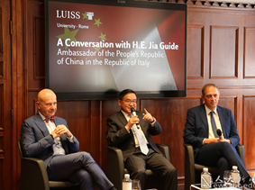 中意美三学位项目”)参加中华人民共和国驻意大利共和国大使座谈会。中华人民共和国驻意大利共和国大使贾桂德,意大利路易斯大学校长安德里亚...